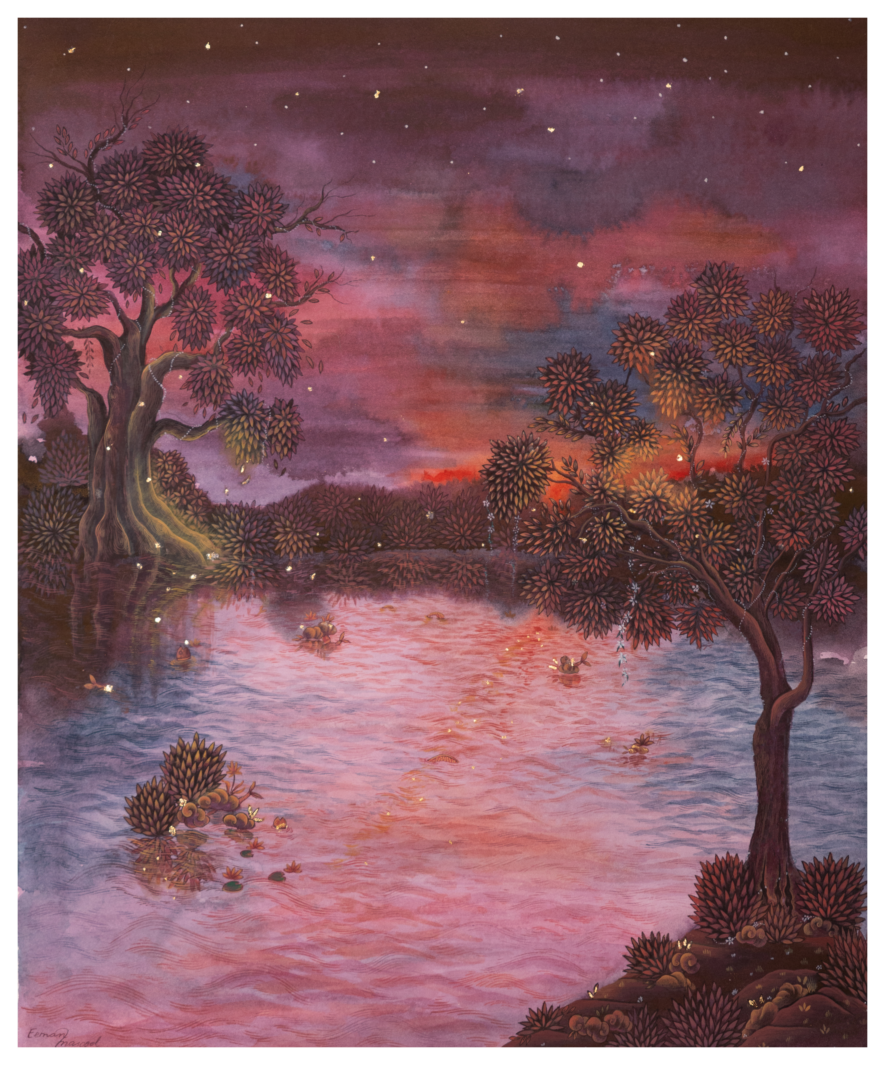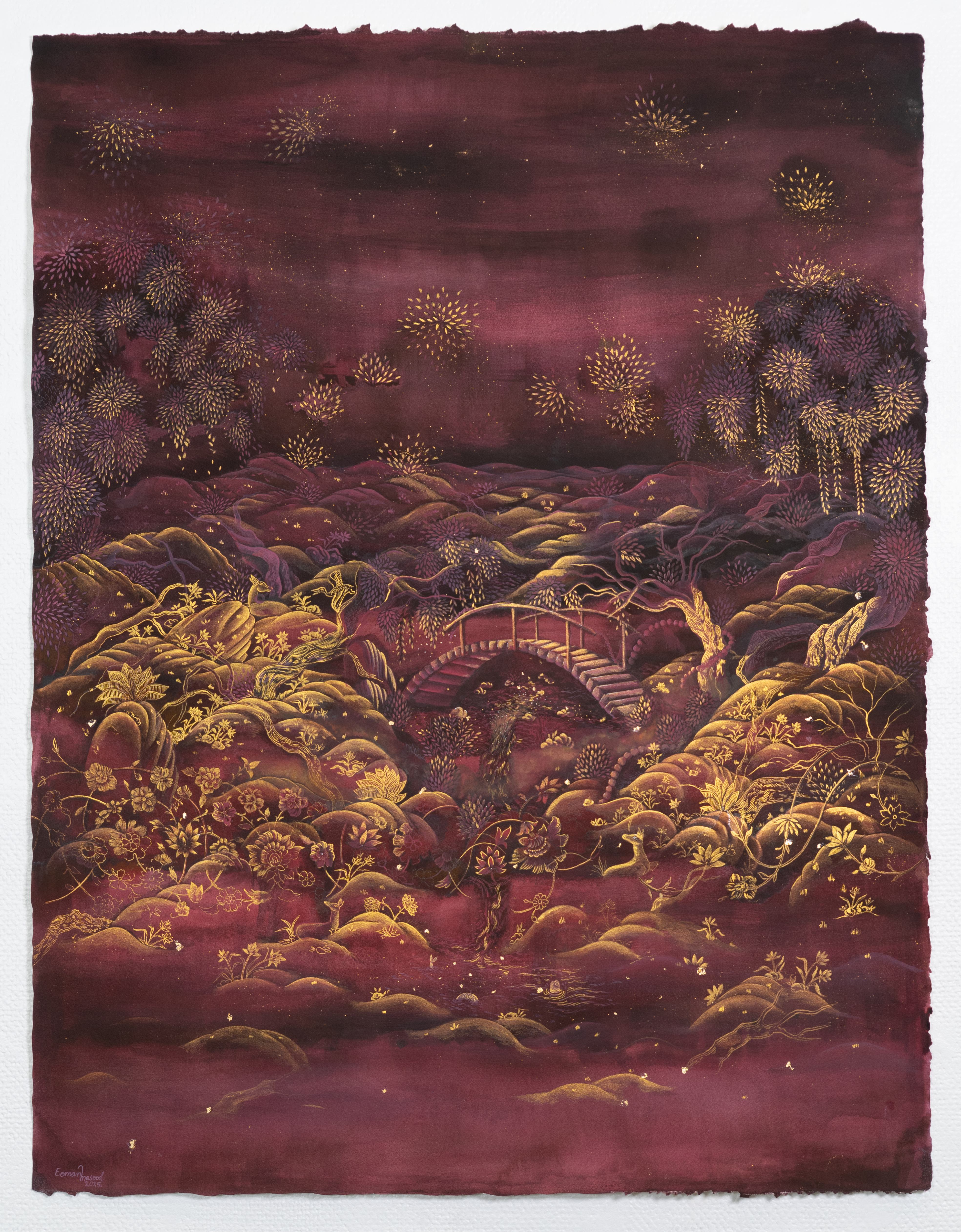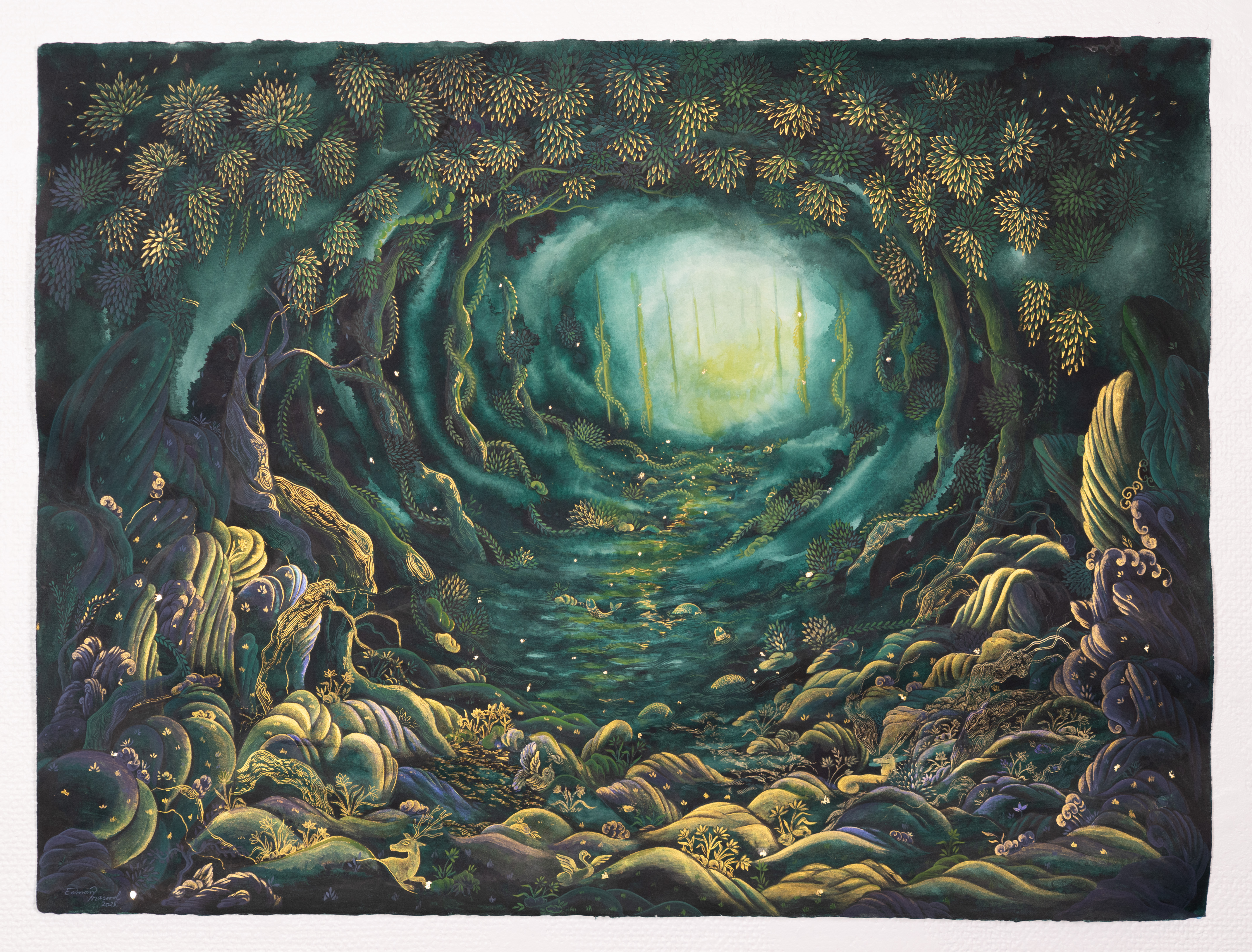 Eeman Masood (b.1998, lives & works in British Columbia, Canada) graduated from the prestigious National College of Arts, Lahore in 2021 with a major in miniature painting. She was awarded a merit scholarship throughout her years at the NCA. Masood’s work revolves around the feeling of nostalgia that comes with loss over a period of time. Looking at the belongings of people who are no longer present, and feeling their presence, that flash of memory is like a dream. This clash between dream and reality evokes longing for the past which is mirrored in her delicately rendered work with faded but yet clear visuals. Muffled in images of ethereal jungles and floralscapes where mythical creatures flaunt in paradiso of personal pleasure and pain is how Masood constructs her narratives onto her laborious miniature paintings.
