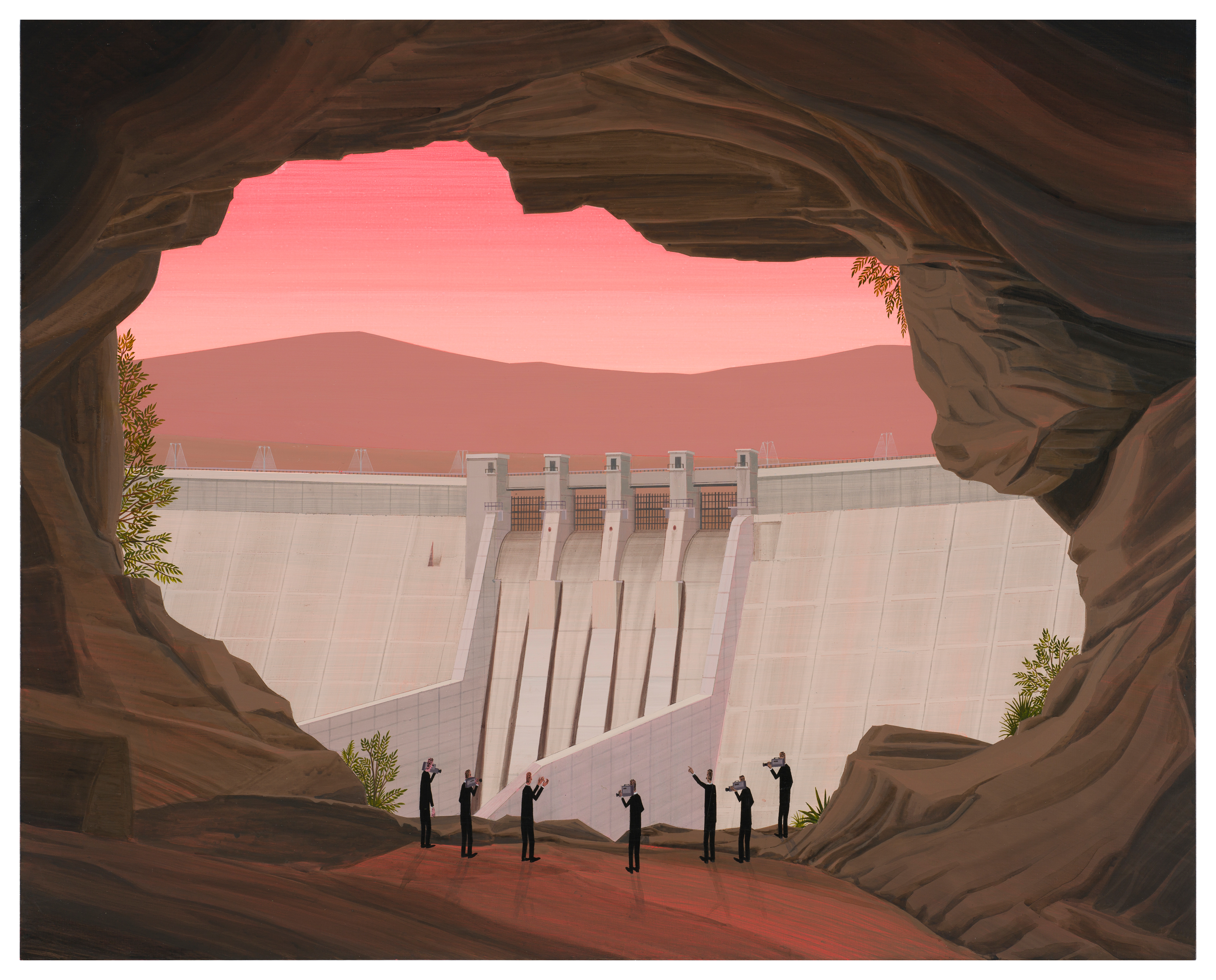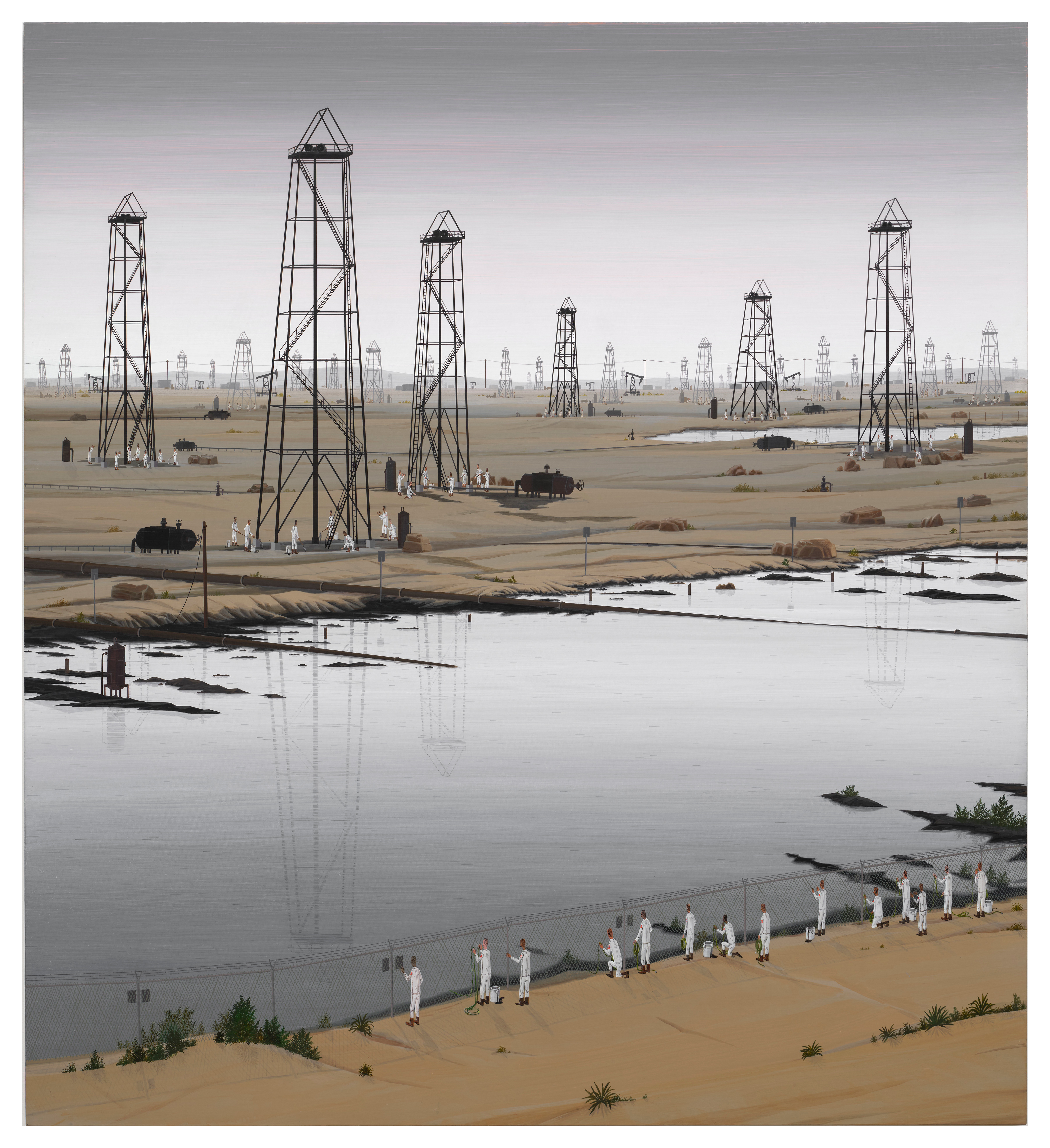 A move away from reality to a more surreal state, is ongoing in Ian Davis’ (b. 1972, Indianapolis, US) eerily prescient dystopian visions. His work charts the follies of man and his compositions circle around repetition & unplanned narratives creating humorous and downright surreal settings.