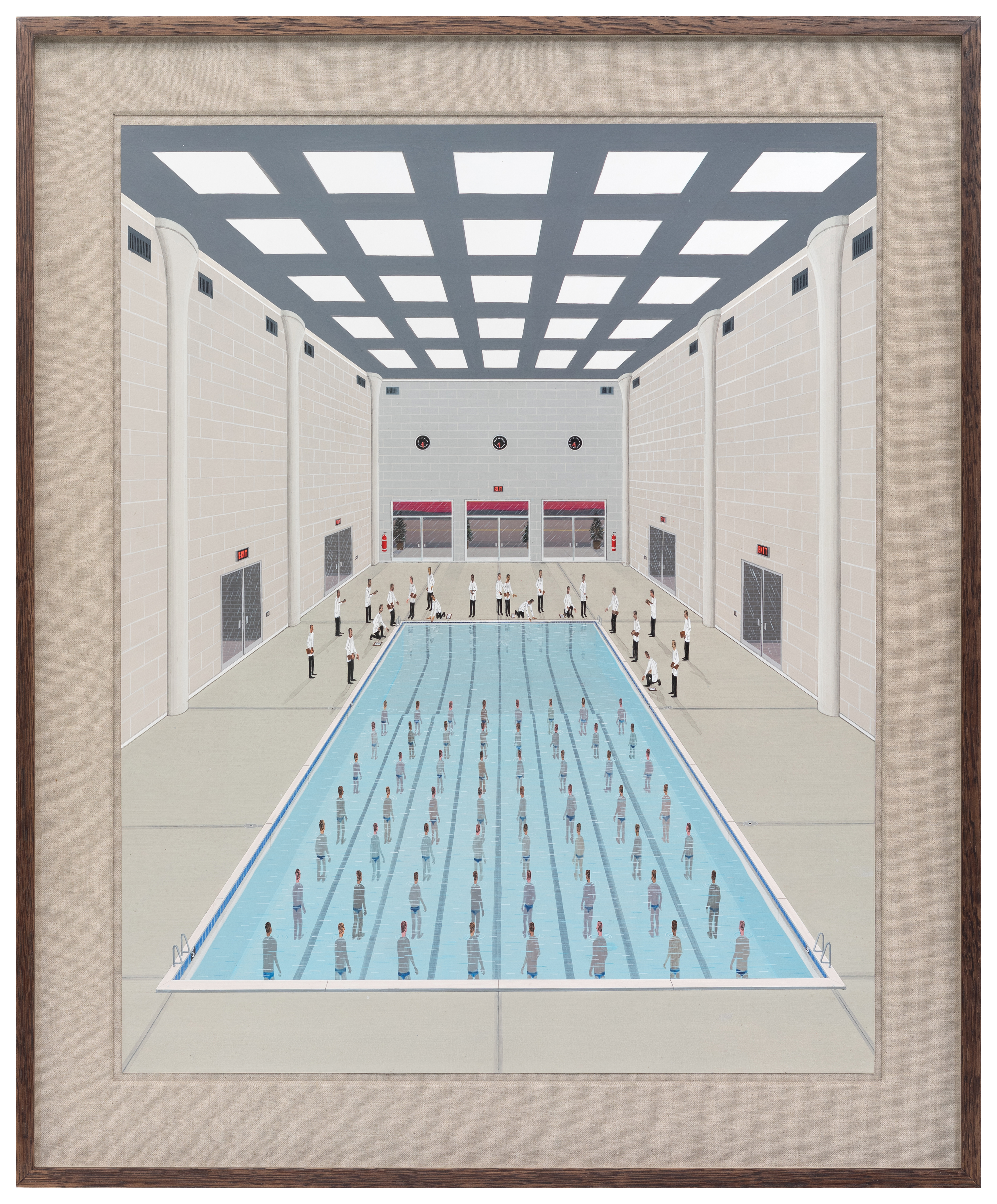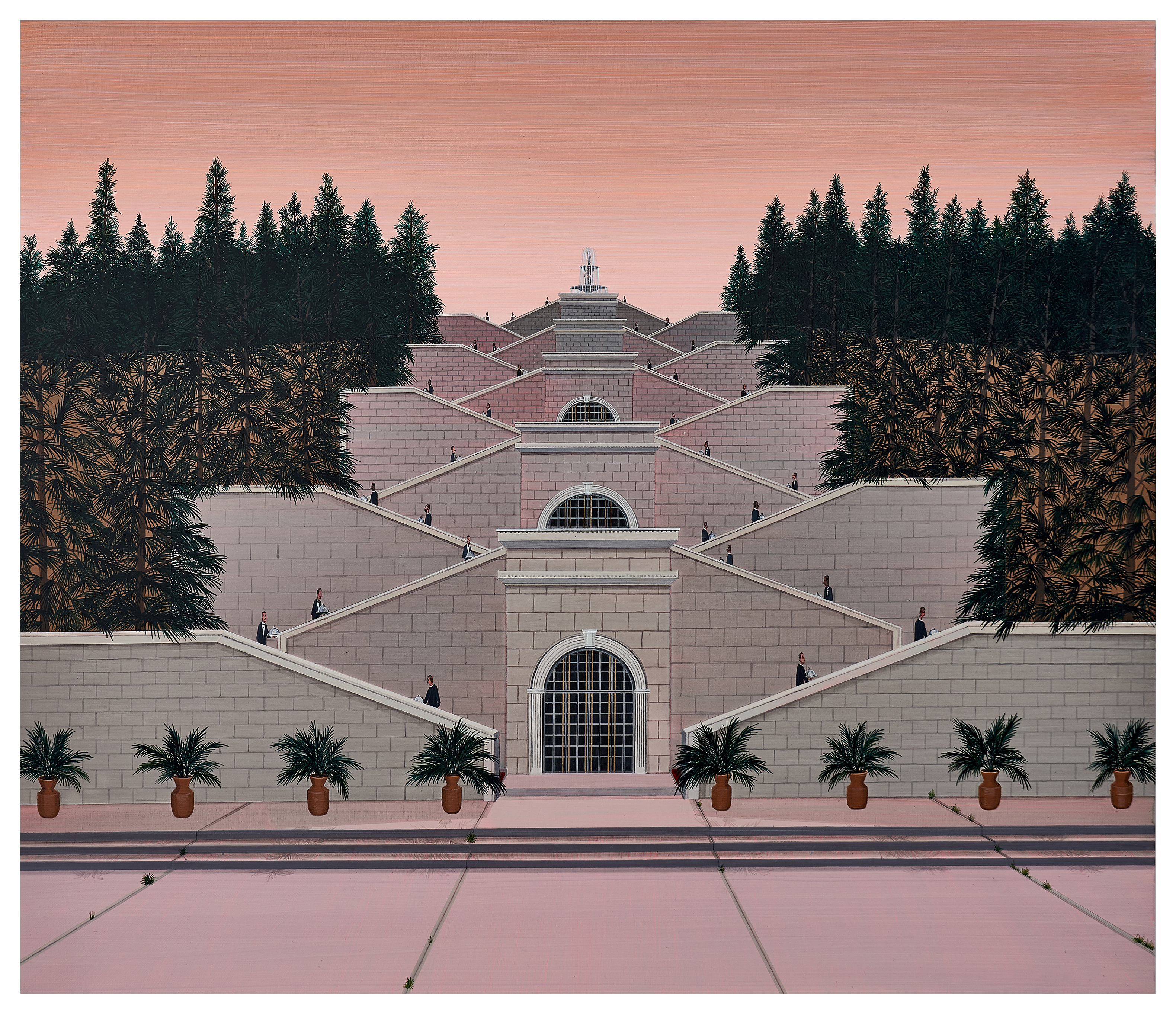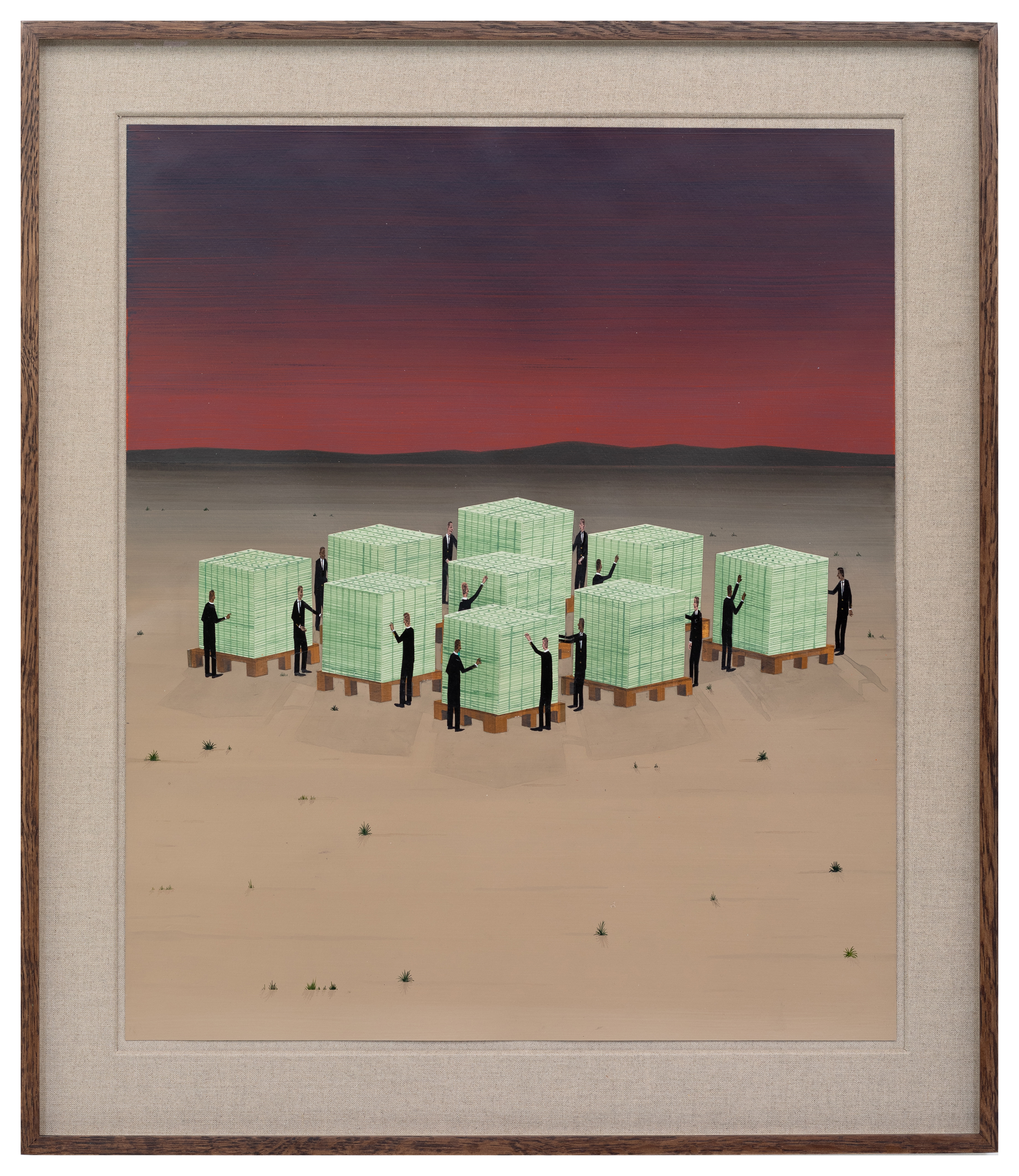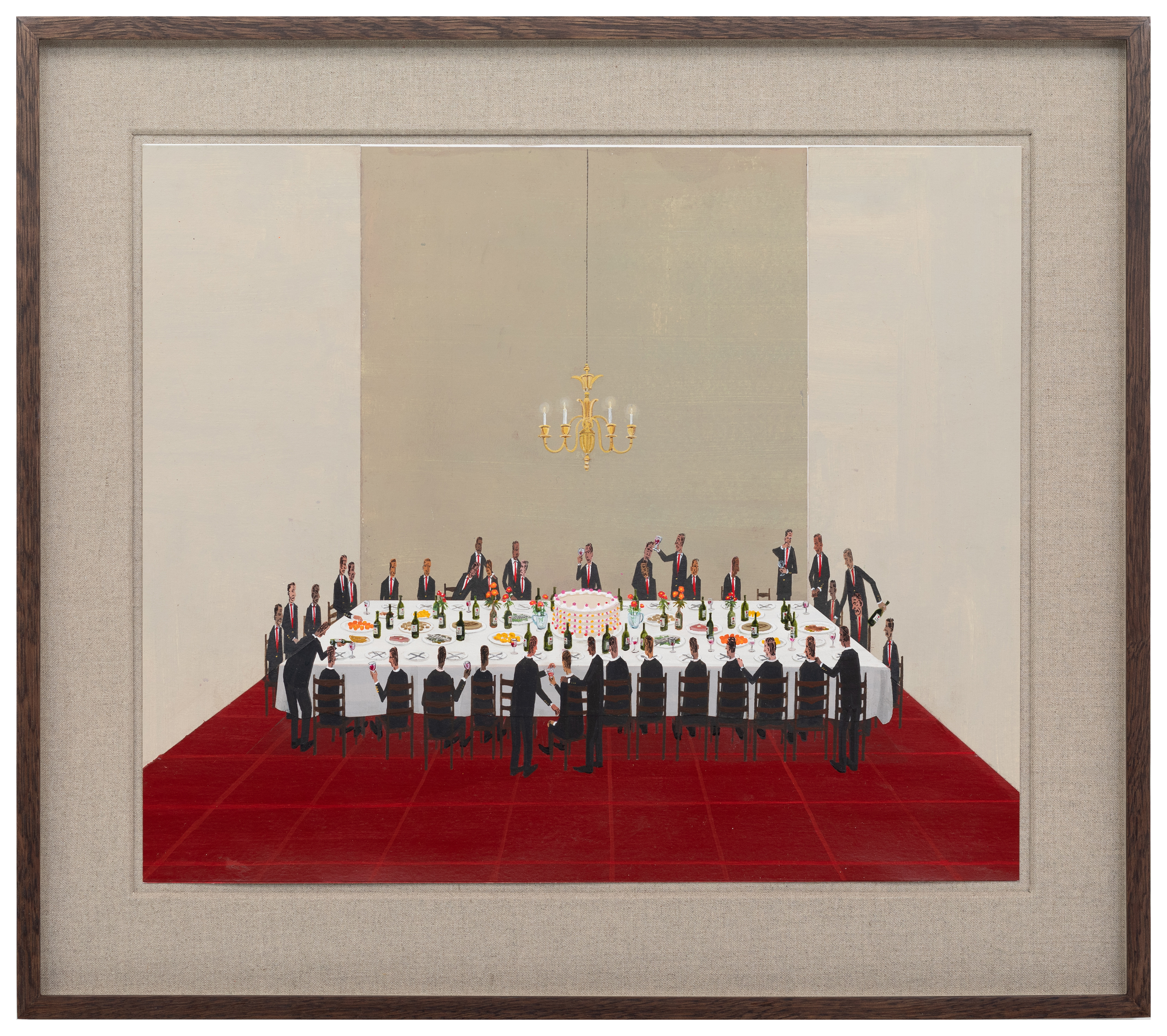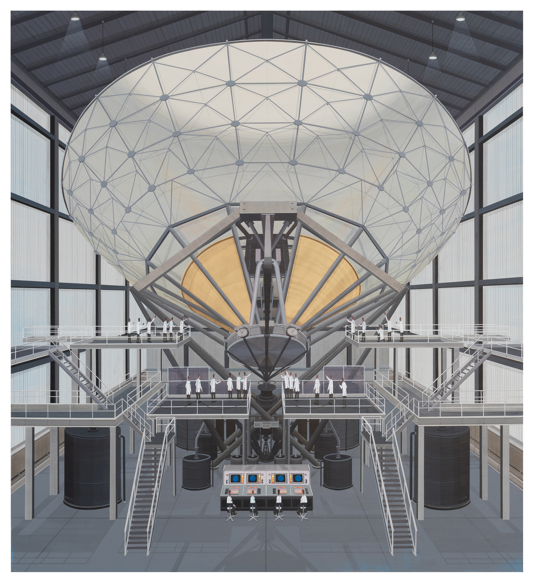 The identity of the tall, lanky men, who almost always appear in dark suits or lab coats, also remains obscure. They are faceless, supra-individual figures – placeholders of a bureaucratic society. These bureaucrats never turn up on their own. They come in herds and packs, and as such the artist likes to arrange them somewhat ornamentally. Many of Davis’s works feature enormous spaces filled with repetitive geometrical details, such as the vast rows of computer banks or dining tables, which evoke the tedium and drudgery of present-day industry.