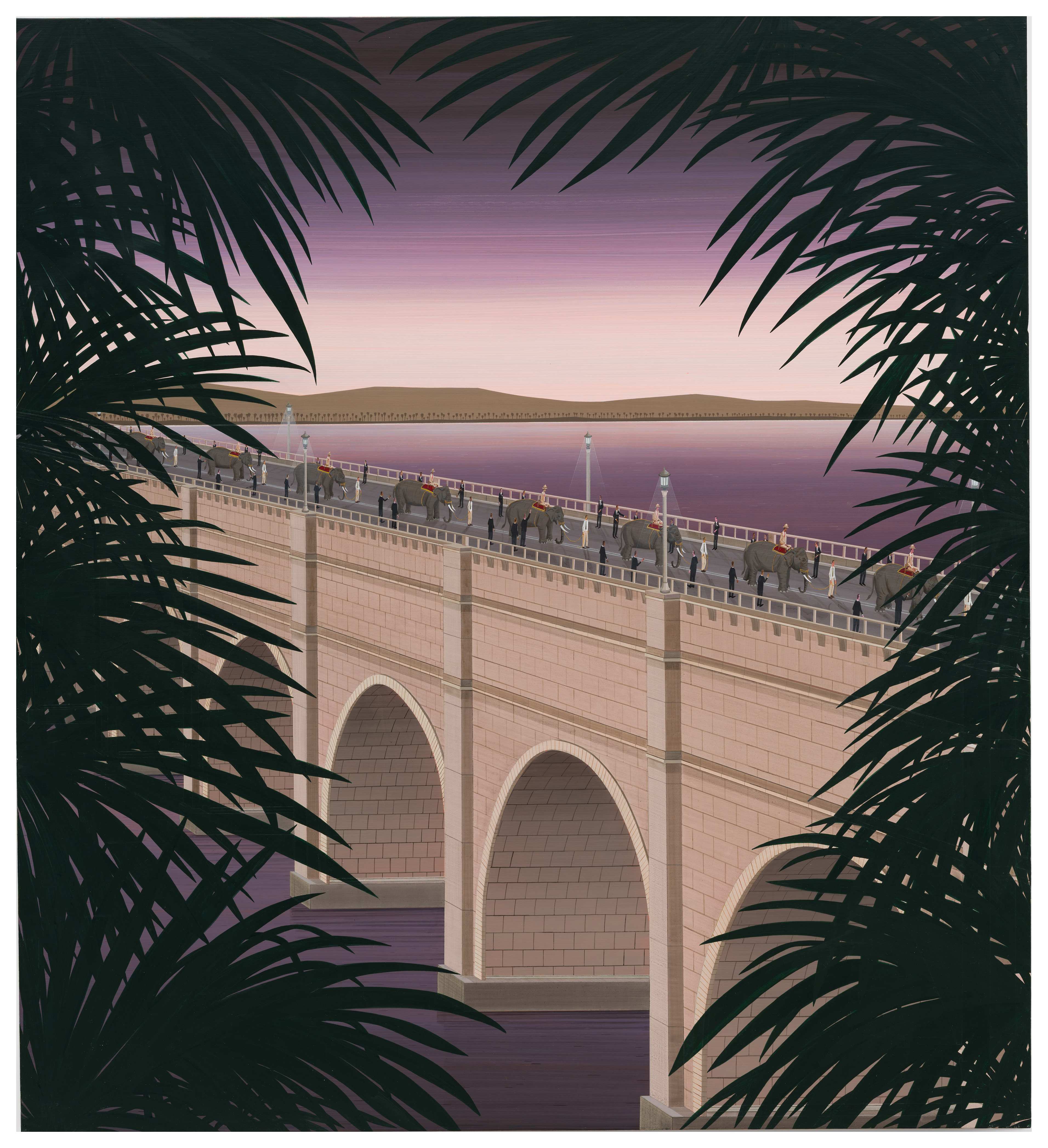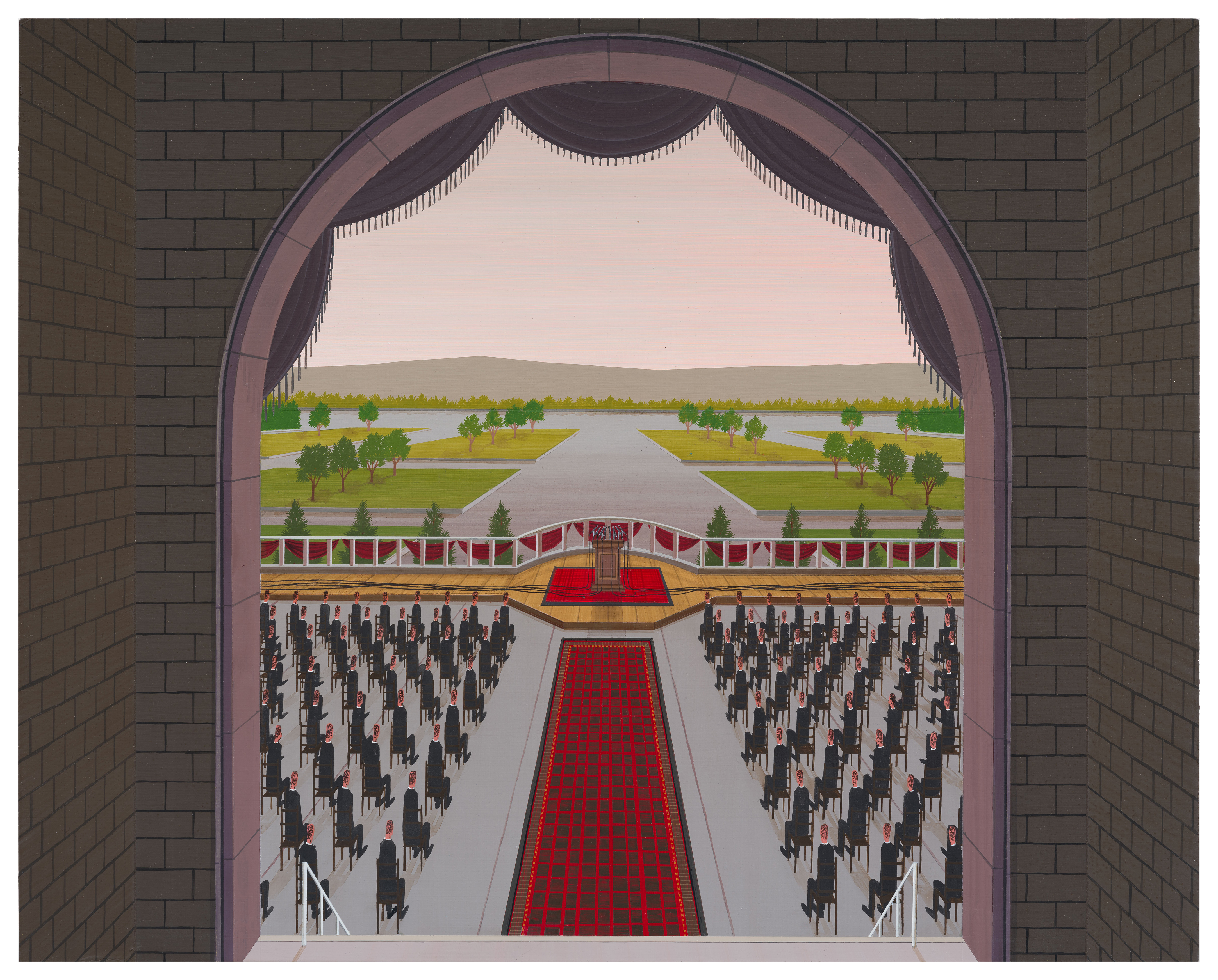 Davis chronicles moments of human gatherings, often immediately before or after an event. As highly condensed and finely rendered his compositions are, nothing is revealed about the triggers or the aftermath. Instead Davis prefers to allow for an element of ambiguity concerning his visual imagery, first setting the stage and then allowing a recurrent activity to unfold within its environs.