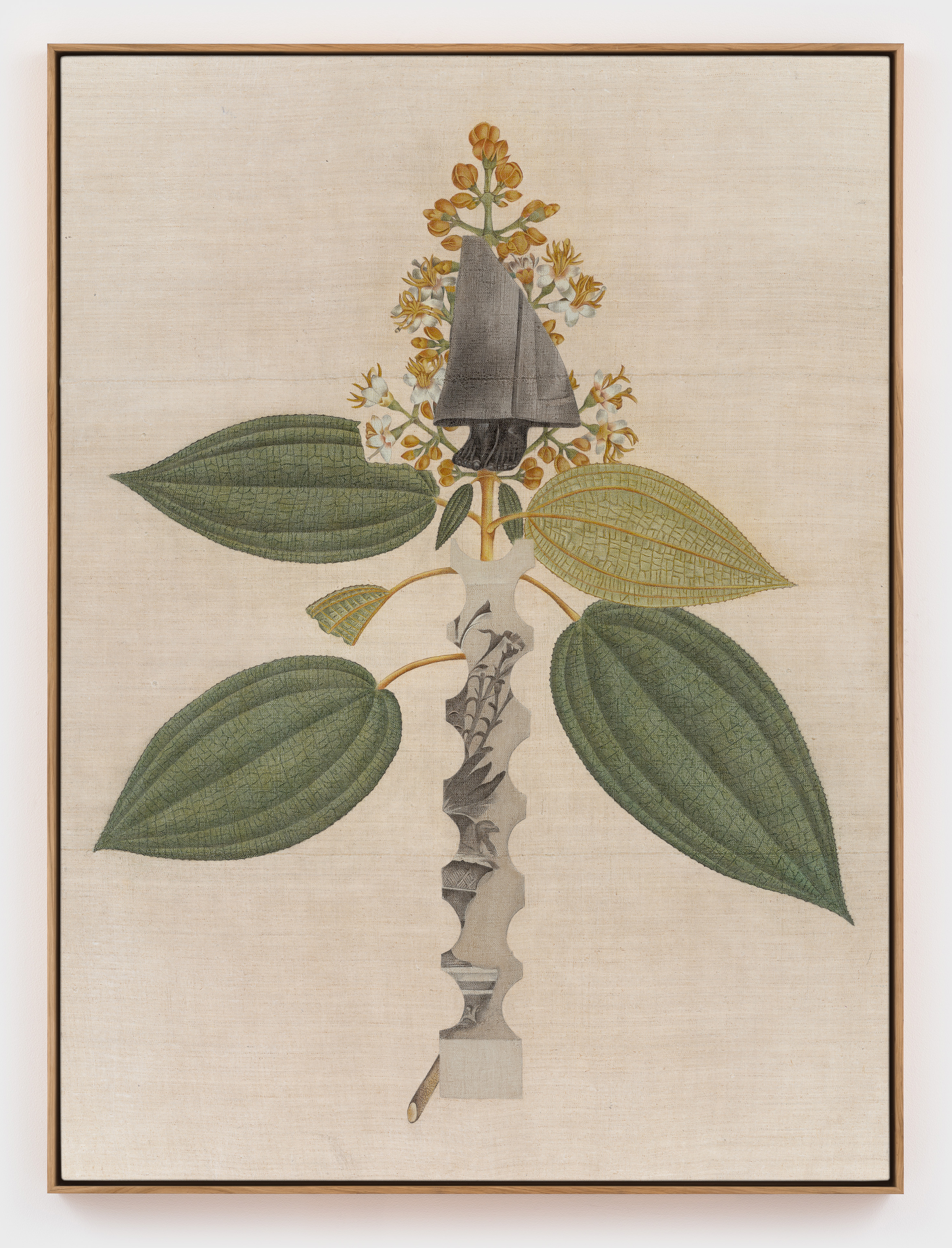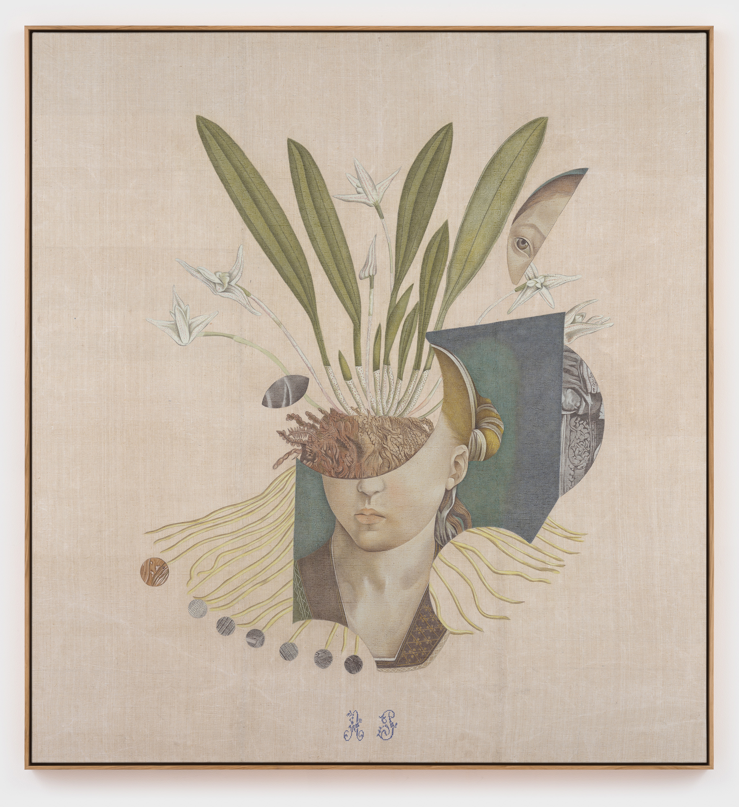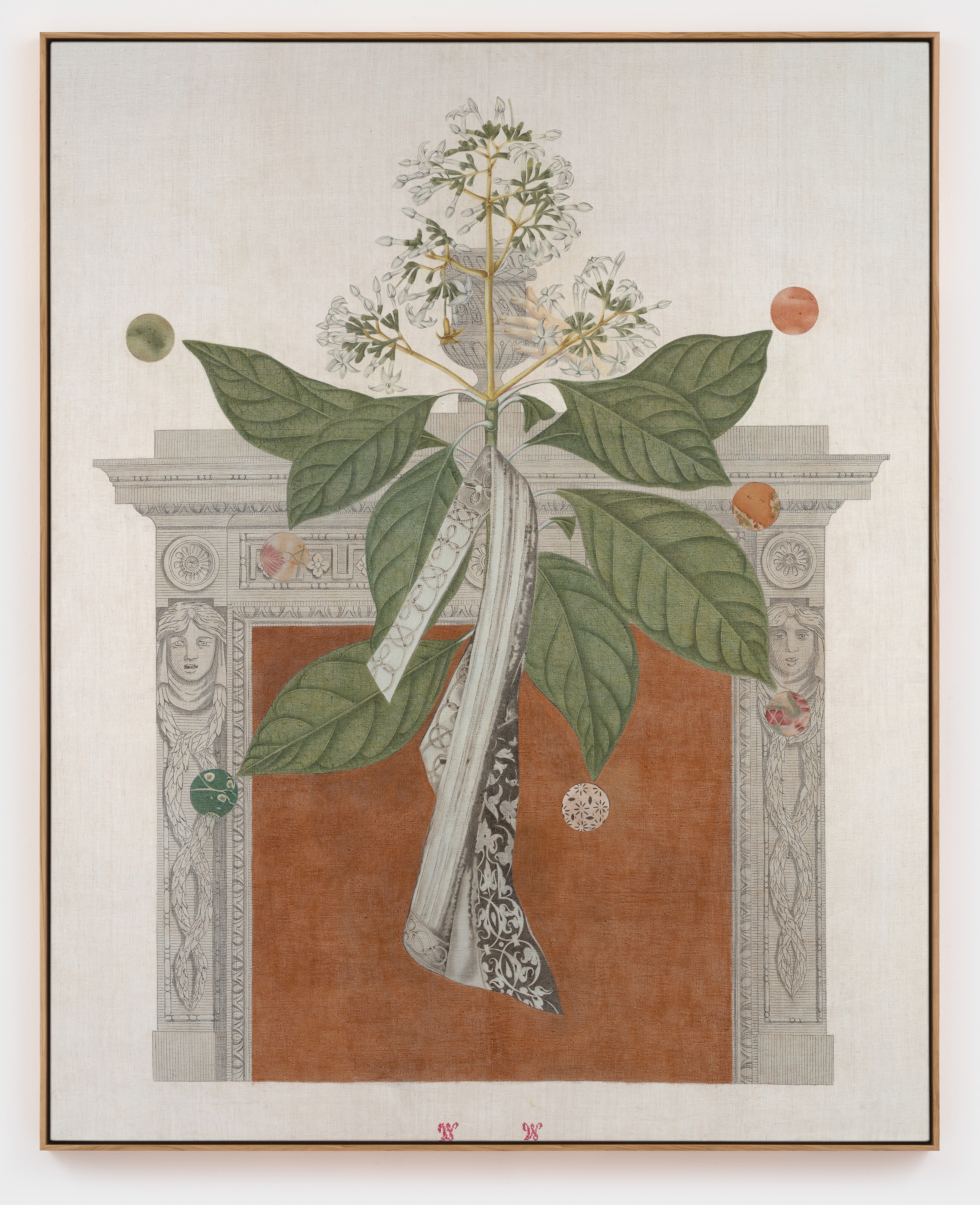 A consummate draftsman, Despont has historically used architectural stencils, graphite, and colored pencils on antique ledger book paper to create works that have been described as “meticulously executed, delicate drawings that hover between sacred geometry, esoteric symbols, and essentialized forms.” Over the past several years, however, the artist has shifted to working in collage—using botanical illustrations, architectural lithographs, and marbled endpapers—and then drawing the collages on antique canvas. In the process, she still engages the techniques learned from using pencil on paper—working methodically and meditatively with progressive layers of rubbed and sanded pigment.