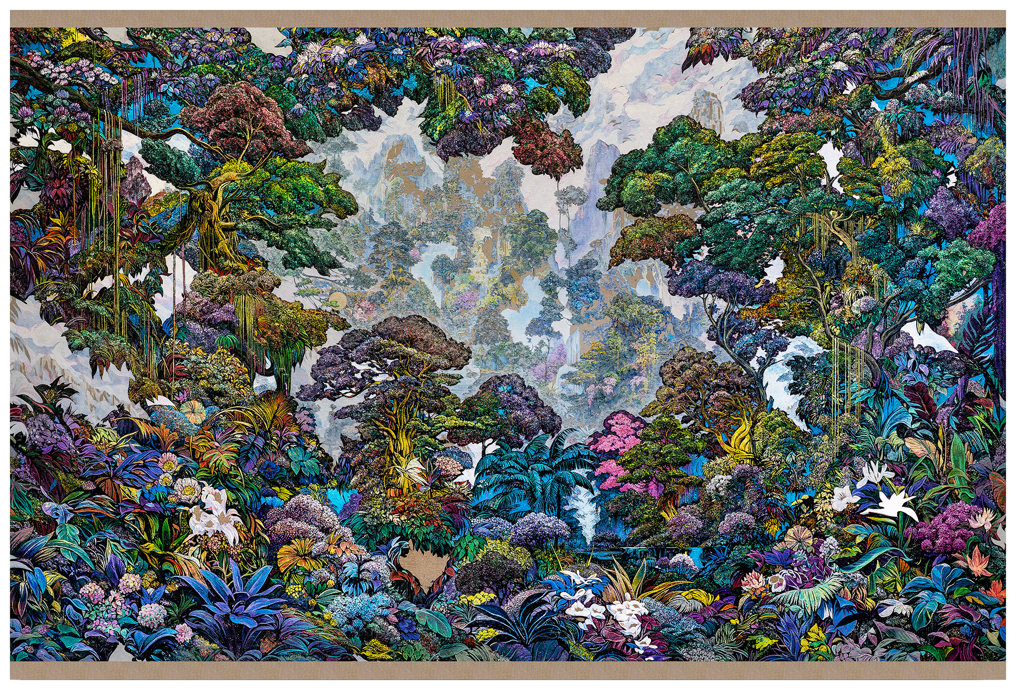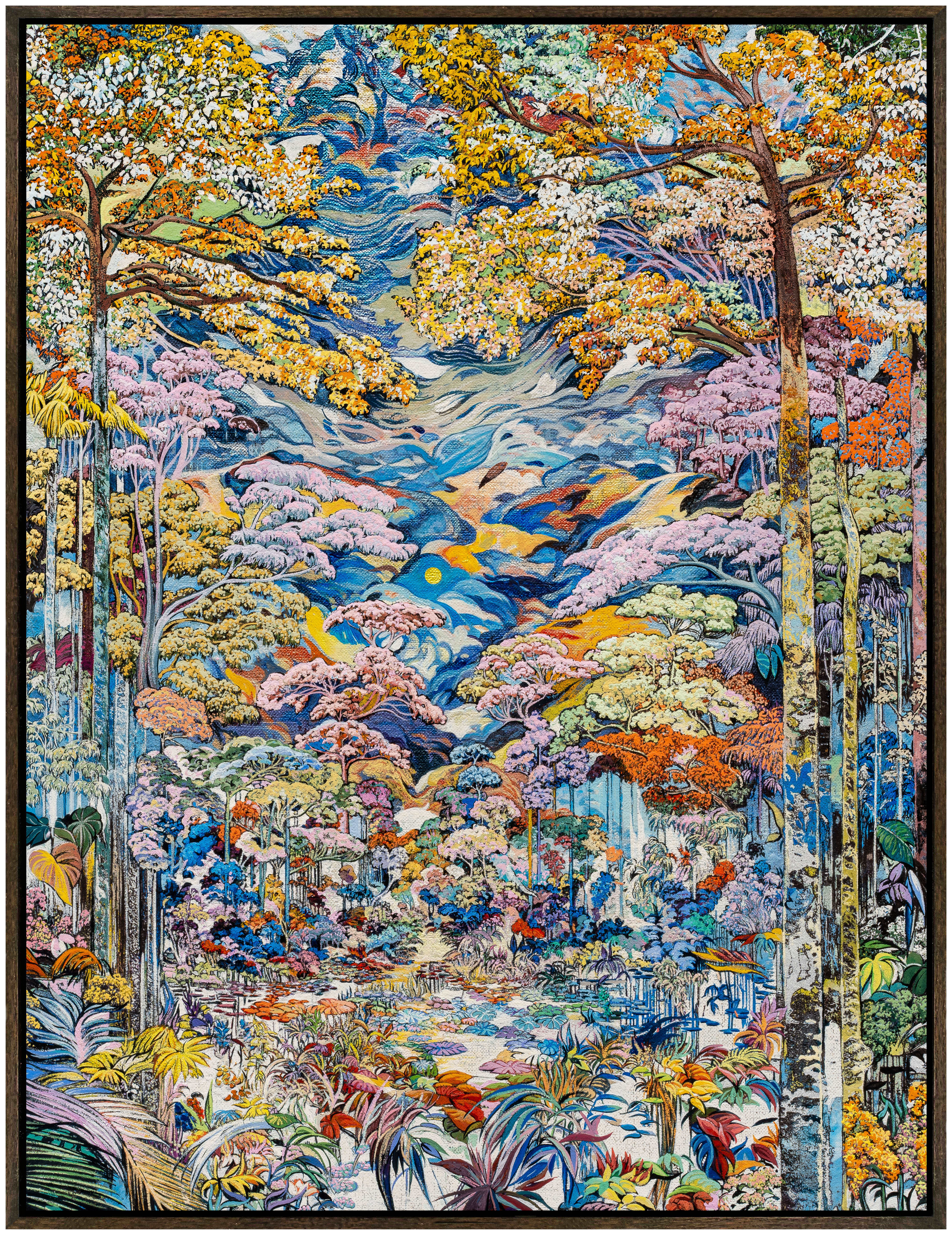 The idea of the persistent image as a source of power that affects our relationships to certain contexts or our reaction to objects is interesting to consider in relation to Giralda’s work. His paintings throw into question the place that nature occupies today in the sprawling urban jungle. Through the act of painting, Giralda opens up a space to ponder the different ways we relate to our environment. The image, taken from the media and made-up from coded programs, is translated onto the canvas. The resulting work plays with the romantic idea of contemplating a pacific landscape, but from the perspective of the hurly burly of contemporary life